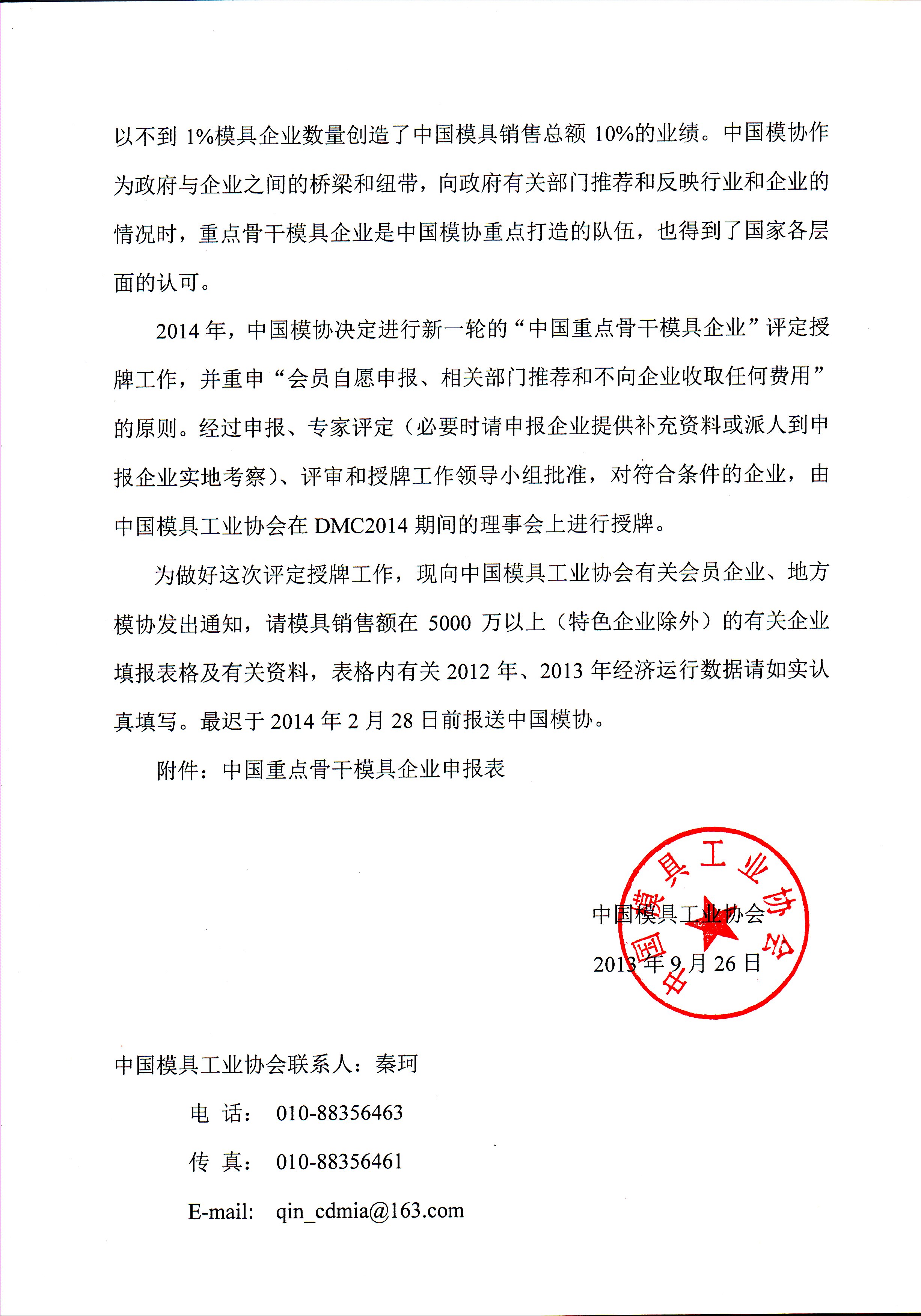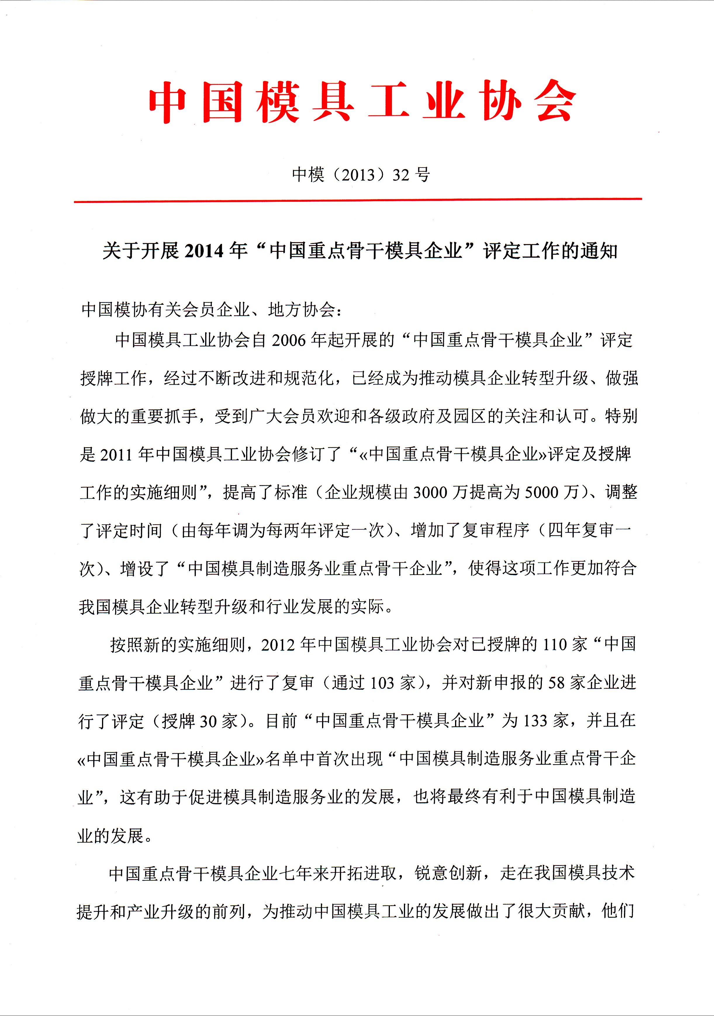 關(guān)于開(kāi)展2014年“中國重點(diǎn)骨干模具企業(yè)”評定工作的通知