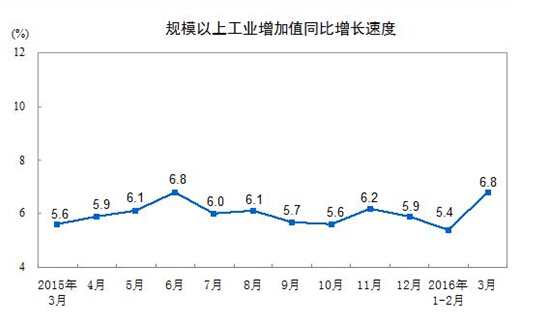 2016年3月份,規模以上工業(yè)增加值同比實(shí)際增長(cháng)6.8%(以下增加值增速均為扣除價(jià)格因素的實(shí)際增長(cháng)率),比1-2月份加快1.4個(gè)百分點(diǎn)。從環(huán)比看,3月份,規模以上工業(yè)增加值比上月增長(cháng)0.64%。一季度,規模以上工業(yè)增加值同比增長(cháng)5.8%。