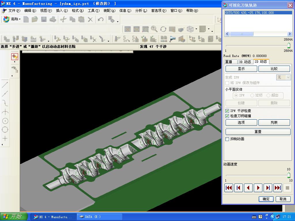 數控程序的編制應盡量使刀具承受載荷均勻,避免刀具走刀方向的突然變化,避免因局部過(guò)切而造成刀具的損壞。通過(guò)數控編程程序補償機床CAM系統能根據加工瞬時(shí)余量的大小,自動(dòng)對進(jìn)給率進(jìn)行優(yōu)化處理,可減少刀具損壞。在加工方法上采用層銑深度優(yōu)先,這樣可降低抬刀次數;刀具進(jìn)刀采用斜插入,避免刀具突然承受巨大載荷而造成刀具的損壞。盡量減少刀具的急速換向,同時(shí)考慮加工不同階段采用不同程序。粗加工中的修圓和光弧連接功能都應去掉,這樣可減少重復刀路,提高效率。對數控粗加工程序刀路及數控程序模擬效果進(jìn)行模擬分析(見(jiàn)圖三),確認數控程序刀路的可靠性,分析得出無(wú)過(guò)切及刀具碰撞現象。在優(yōu)化程序時(shí)盡量考慮加工余量徑向大于軸向,主要是考慮到走刀時(shí),如果刀具發(fā)生斷刀現象,徑向比軸向更容易扎刀。