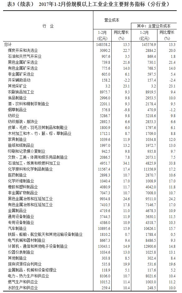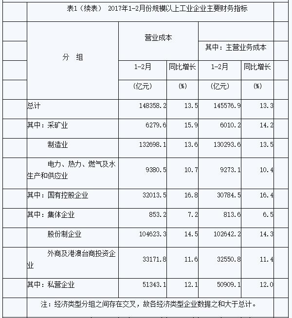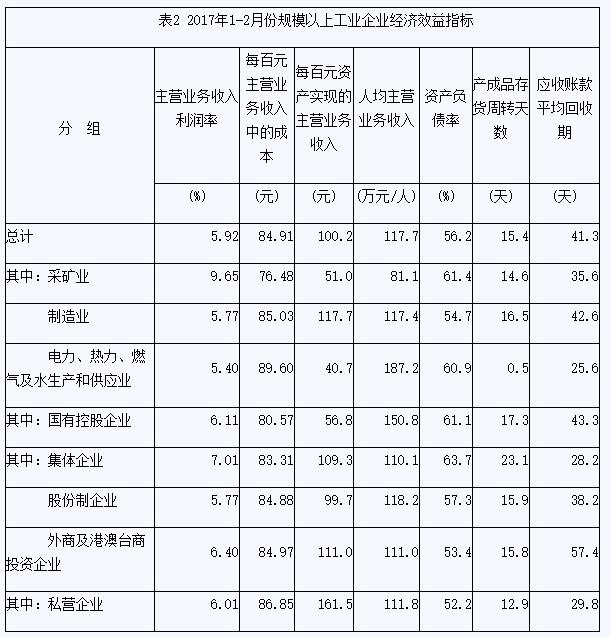 表1  2017年1-2月份規模以上工業(yè)企業(yè)主要財務(wù)指標