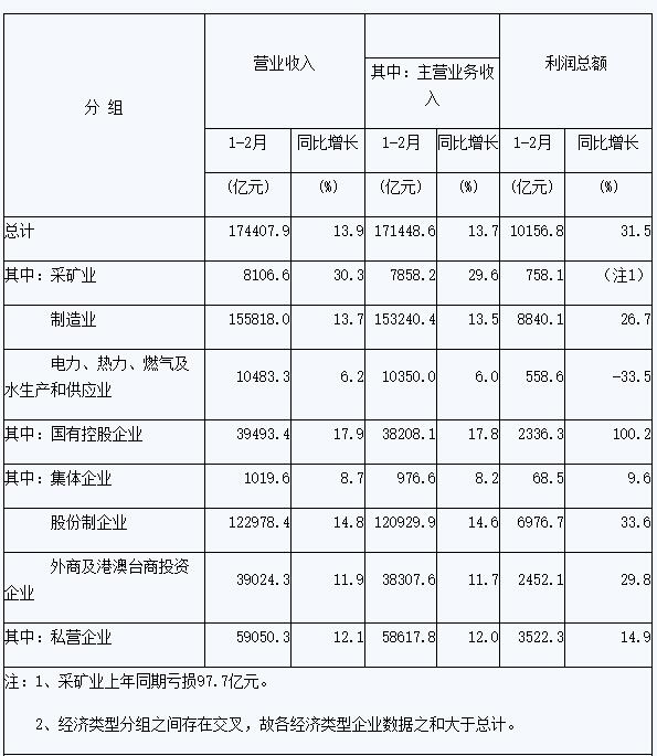 1-2月份,全國規模以上工業(yè)企業(yè)實(shí)現利潤總額10156.8億元,同比增長(cháng)31.5%。