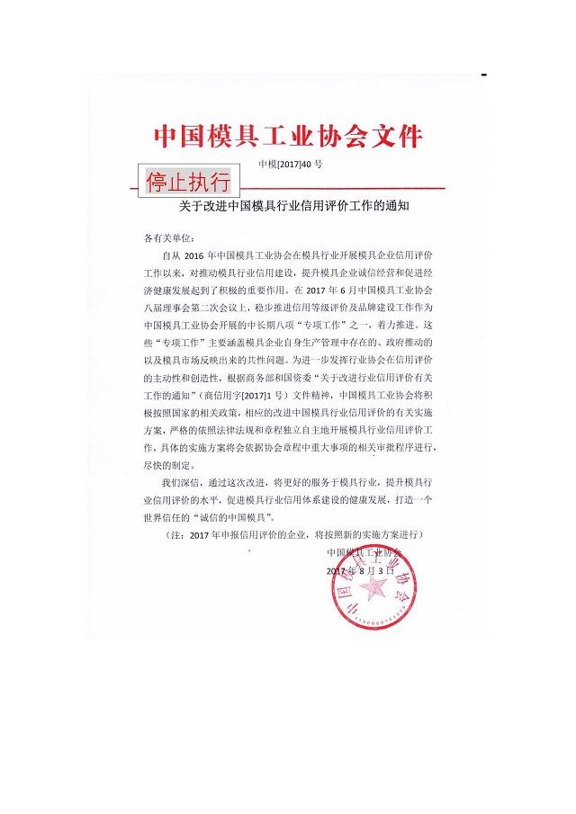 關(guān)于改進(jìn)中國模具行業(yè)信用評價(jià)工作的通知