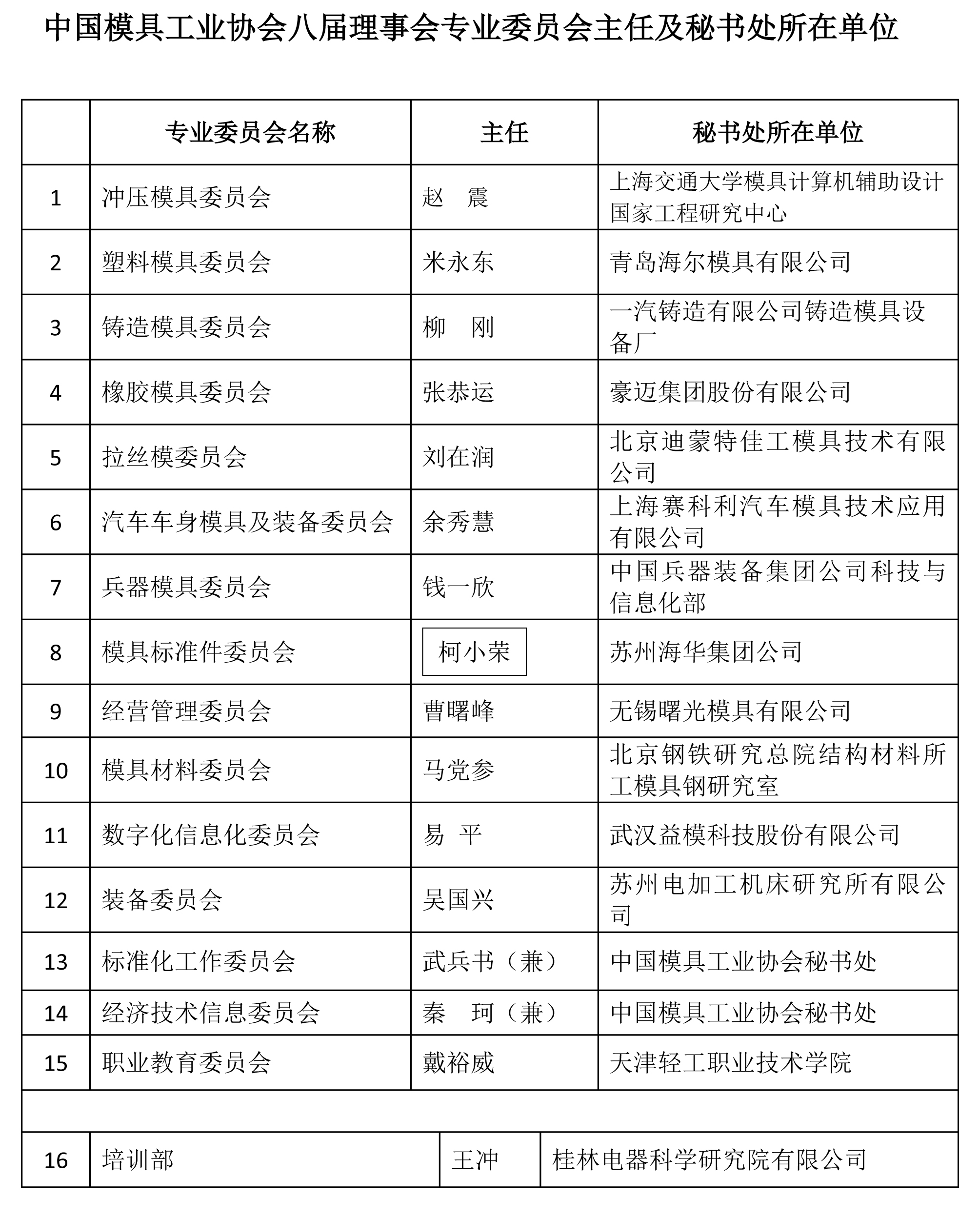 中國模具工業(yè)協(xié)會(huì )八屆理事會(huì )專(zhuān)業(yè)委員會(huì )主任及秘書(shū)處所在單位