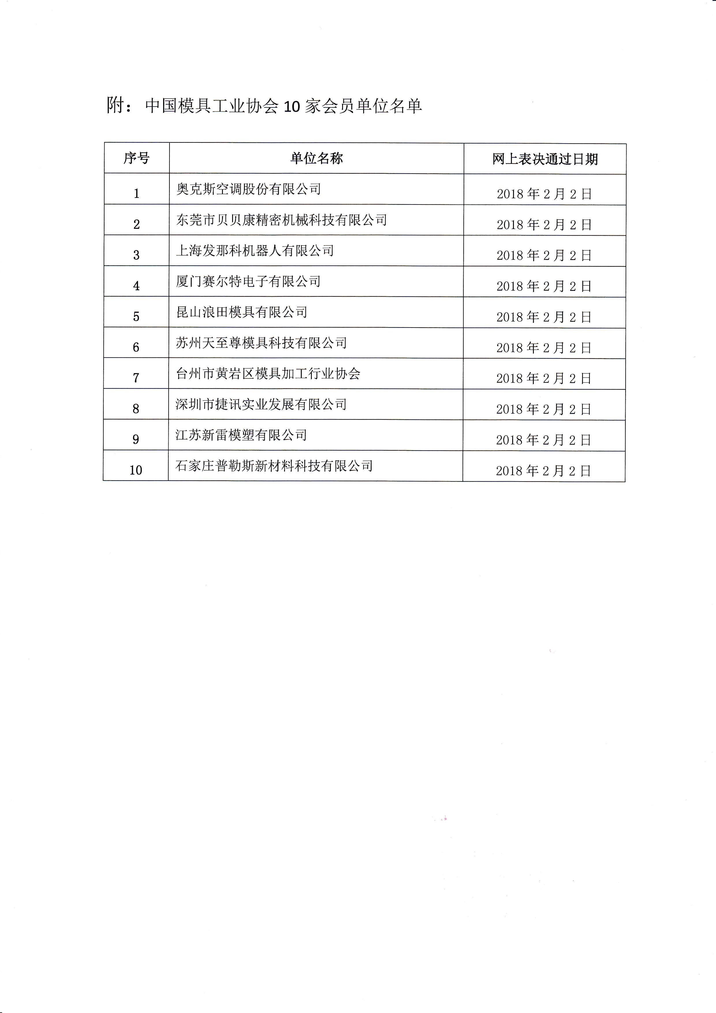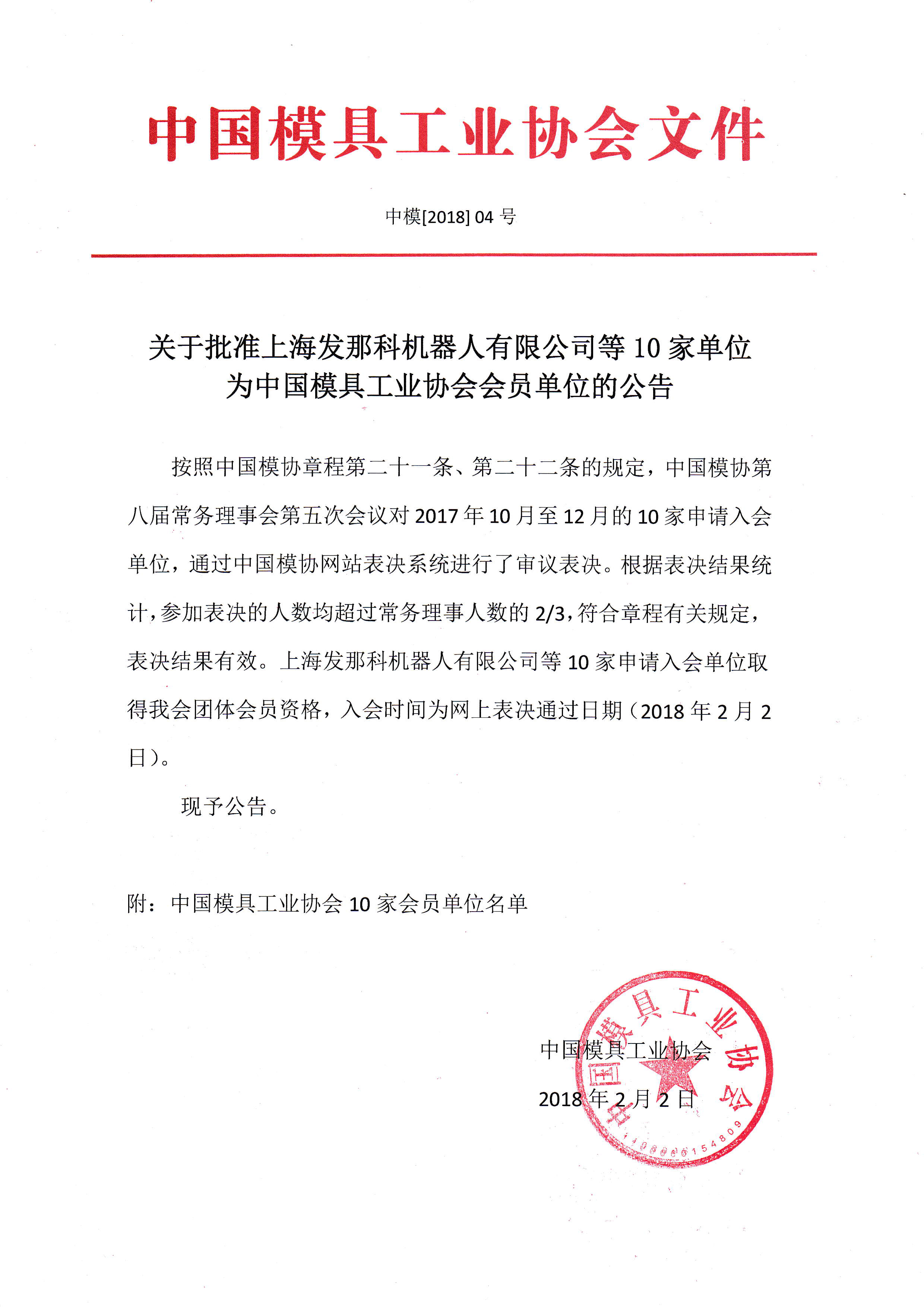 關(guān)于批準上海發(fā)那科機器人有限公司等10家單位為中國模具工業(yè)協(xié)會(huì )會(huì )員單位的公告