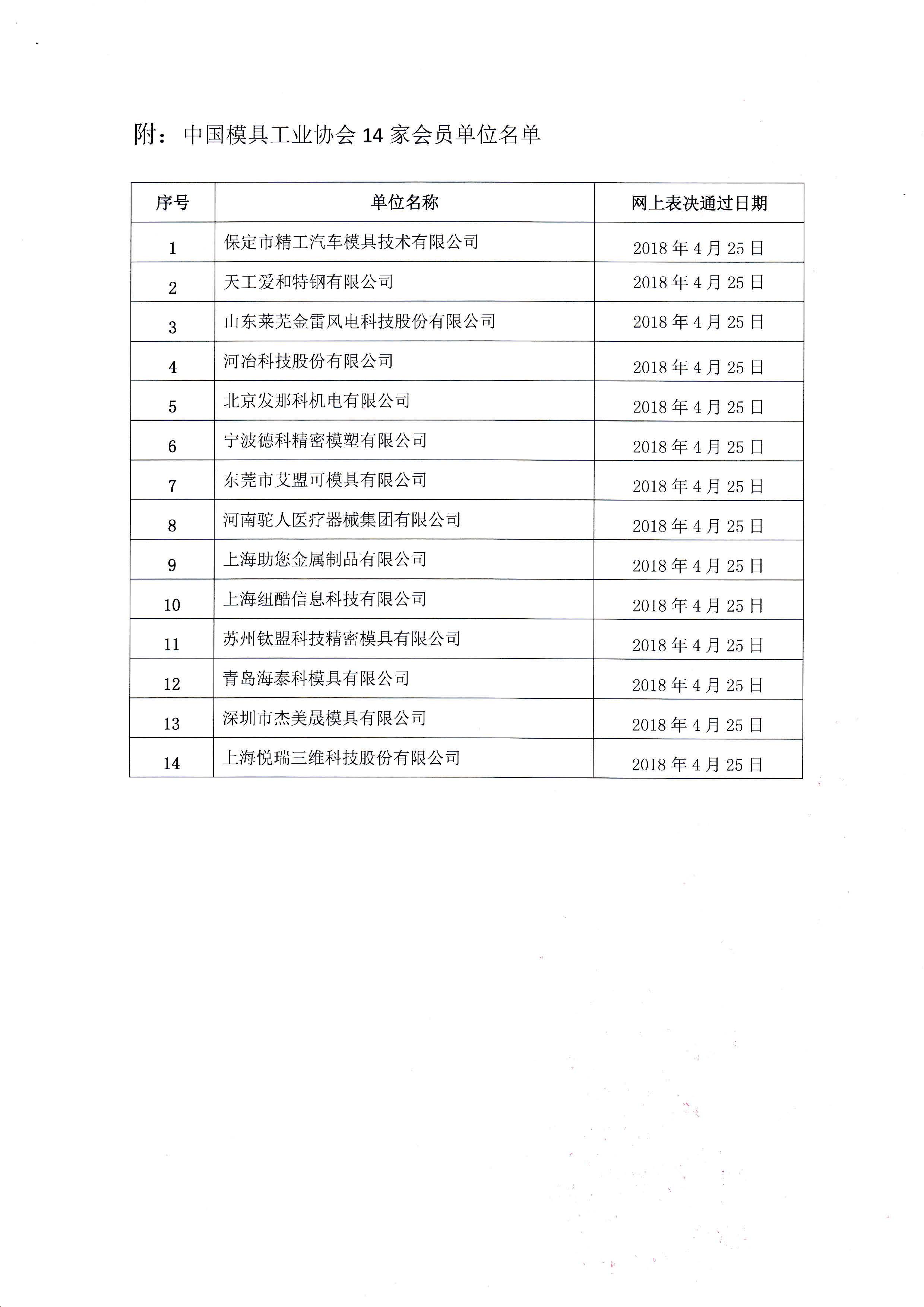 關(guān)于批準保定市精工汽車(chē)模具技術(shù)有限公司等14家單位為中國模具工業(yè)協(xié)會(huì )會(huì )員單位的公告