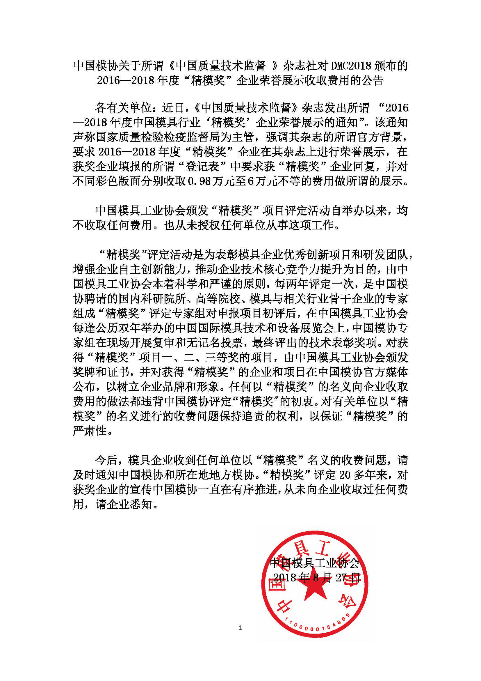 中國模協(xié)關(guān)于所謂《中國質(zhì)量技術(shù)監督 》雜志對DMC2018頒布的2016—2018年度“精模獎”企業(yè)進(jìn)行所謂榮譽(yù)展示的公告