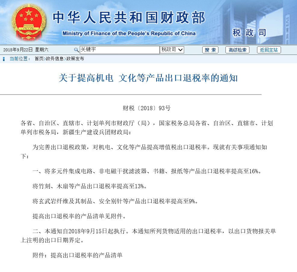 中華人民共和國財政部官網(wǎng)發(fā)布的《關(guān)于提高機電 文化等產(chǎn)品出口退稅率的通知》財稅(2018)93號 中所列產(chǎn)品從