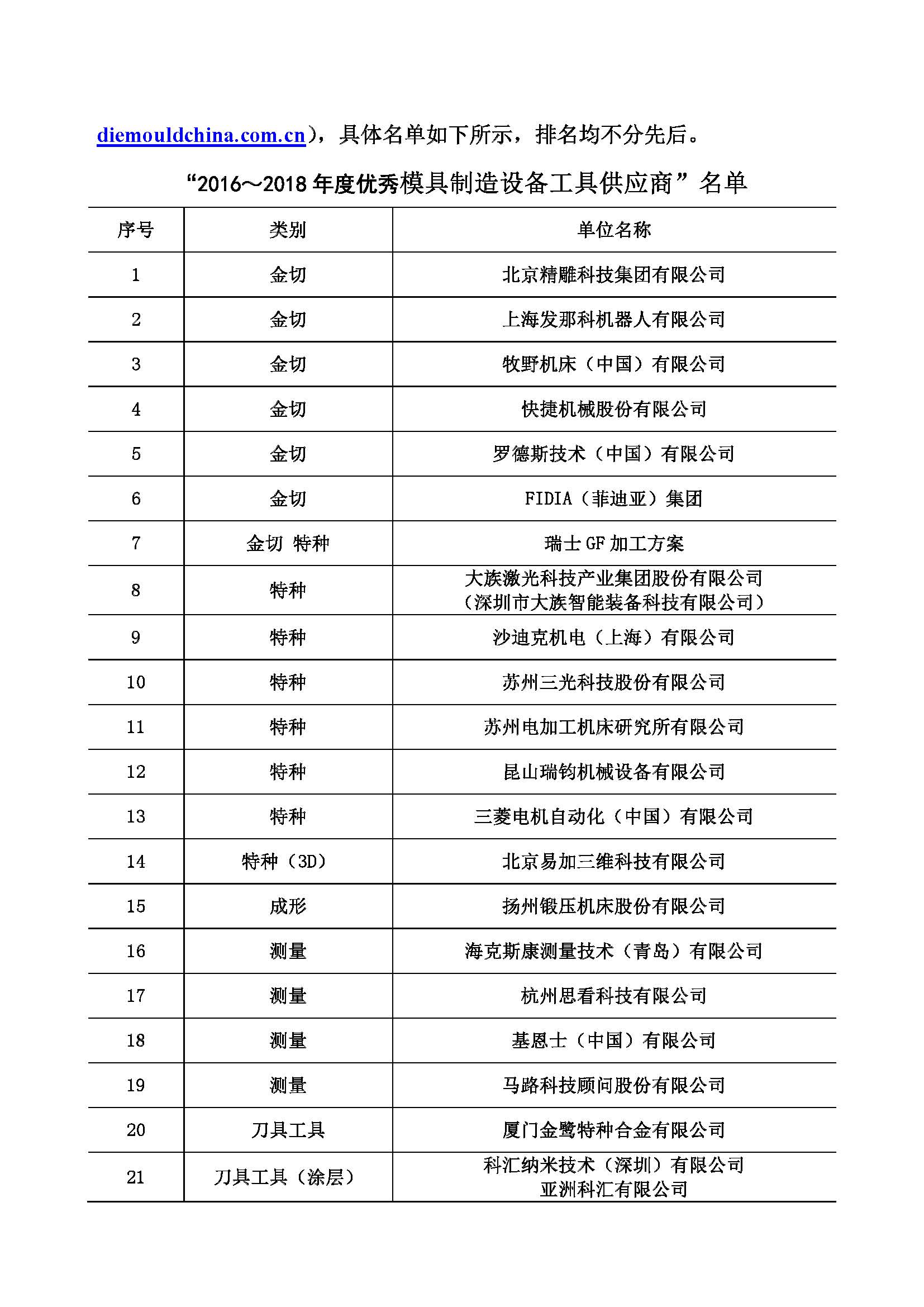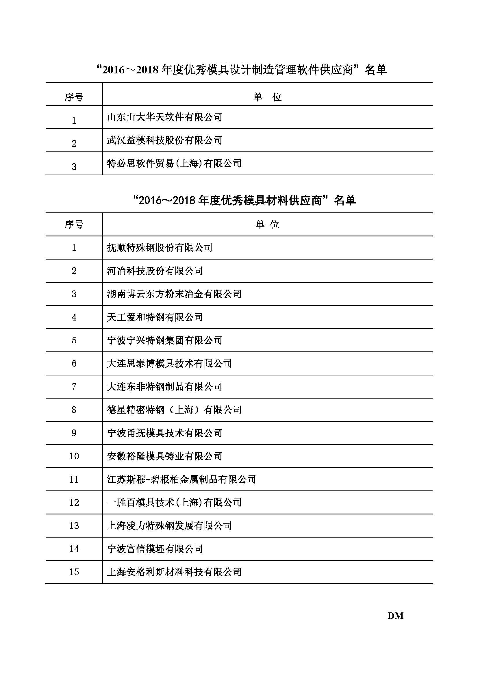 2016~2018年度優(yōu)秀模具制造設備工具供應商、 優(yōu)秀模具設計制造管理軟件供應商、 優(yōu)秀模具材料供應商評定結果