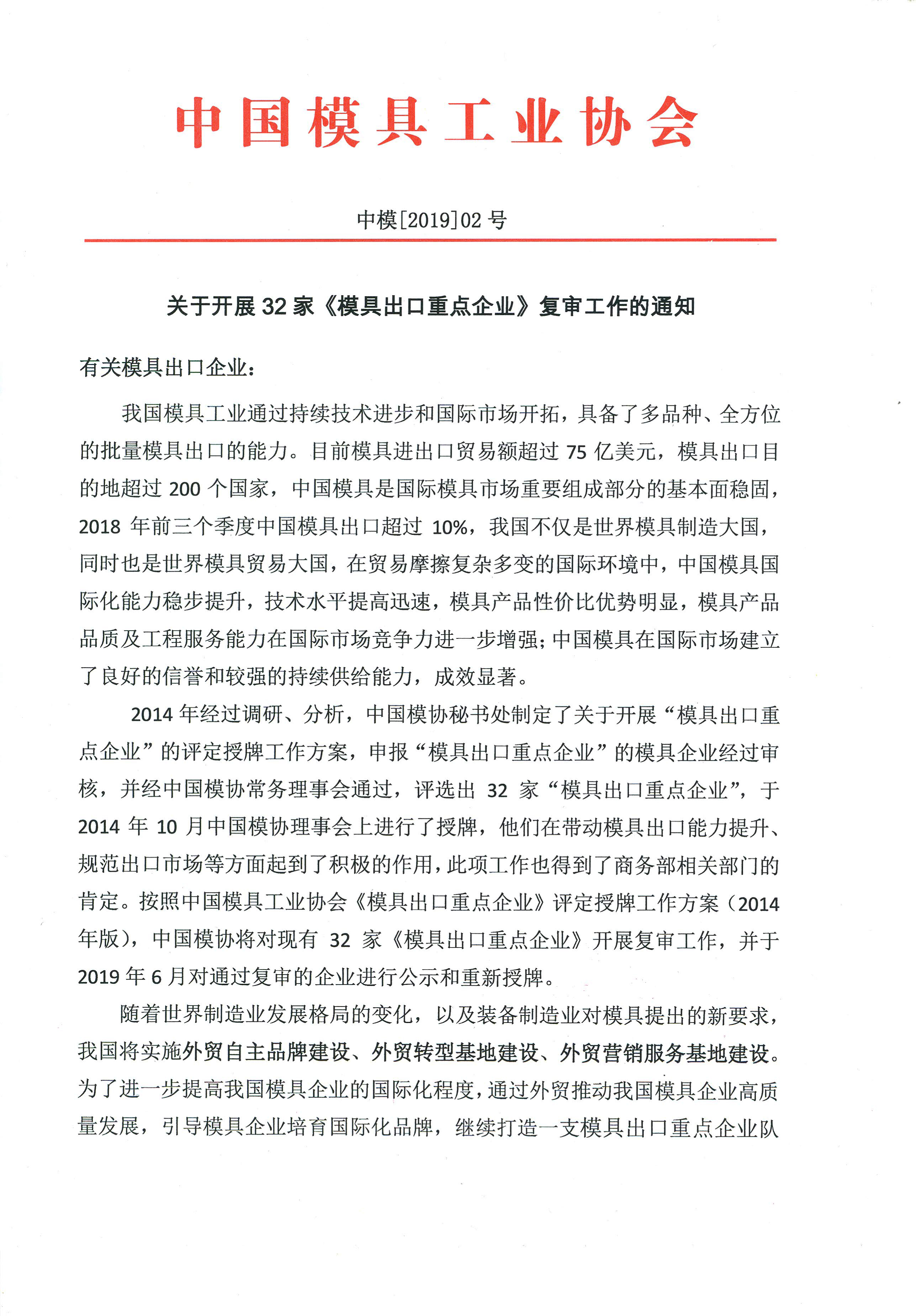關(guān)于開(kāi)展32家《模具出口重點(diǎn)企業(yè)》復審工作的通知