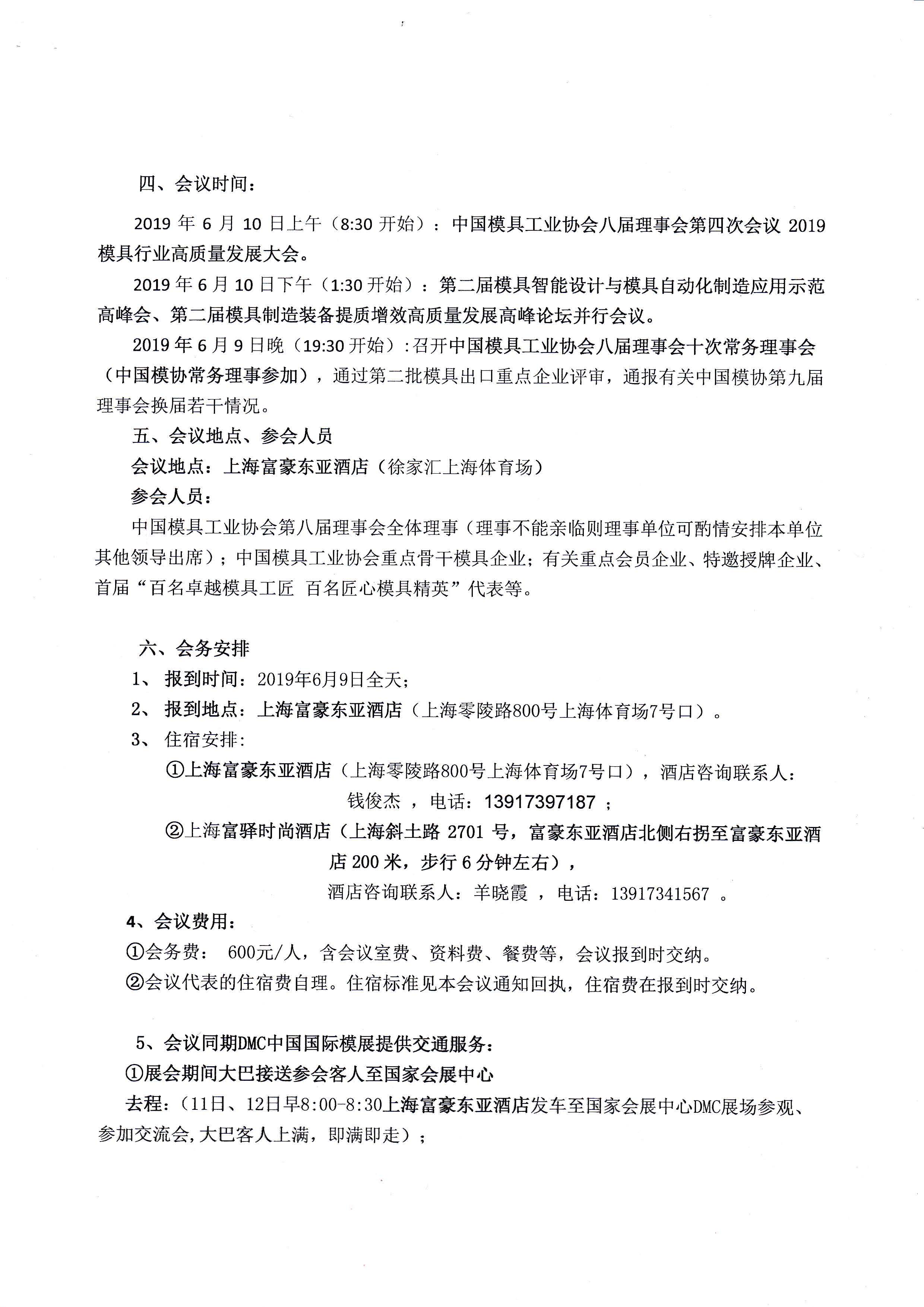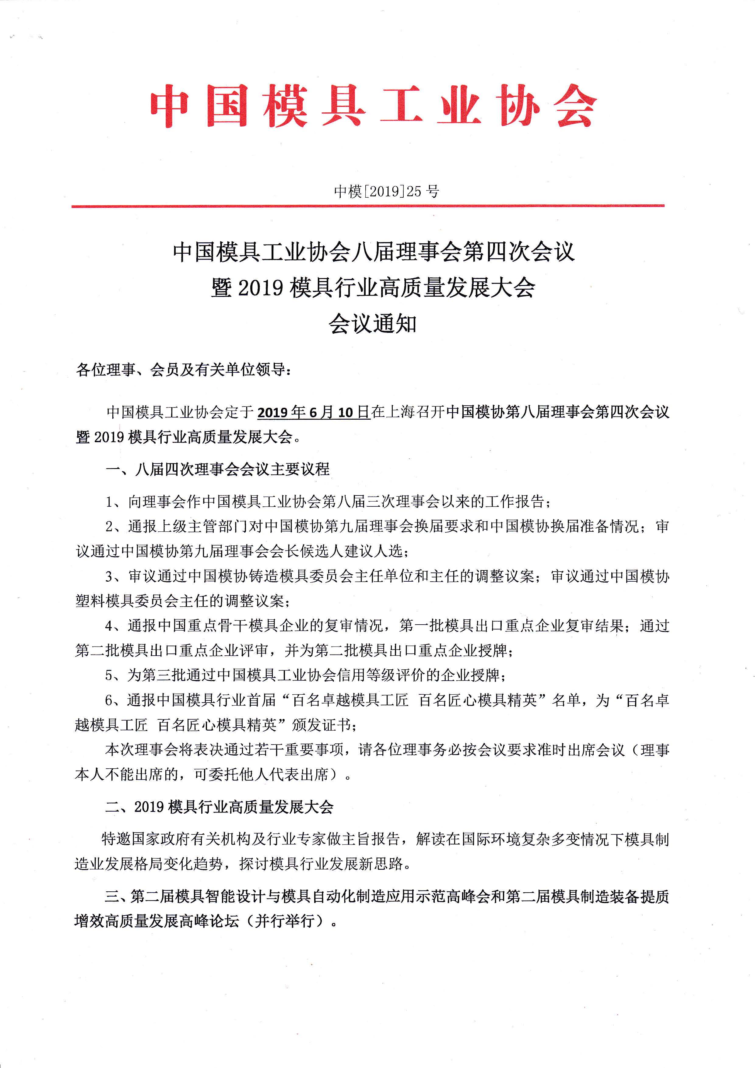 中國模具工業(yè)協(xié)會(huì )八屆理事會(huì )第四次會(huì )議暨2019模具行業(yè)高質(zhì)量發(fā)展大會(huì )會(huì )議通知