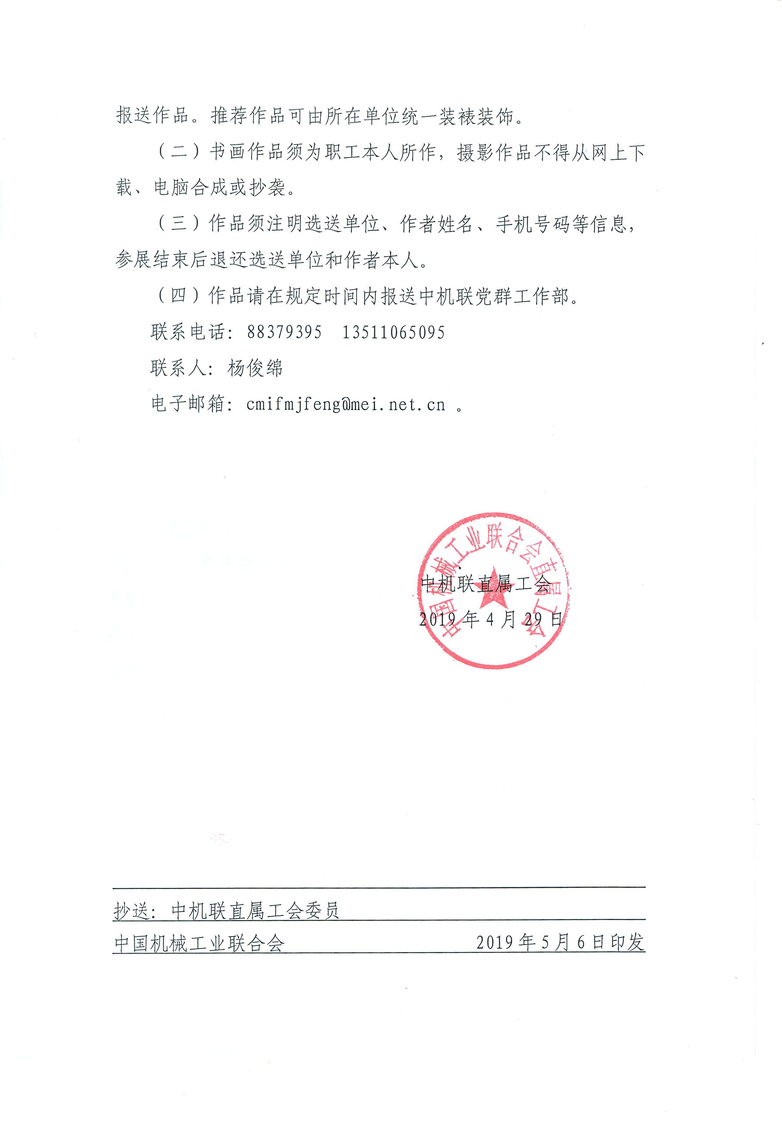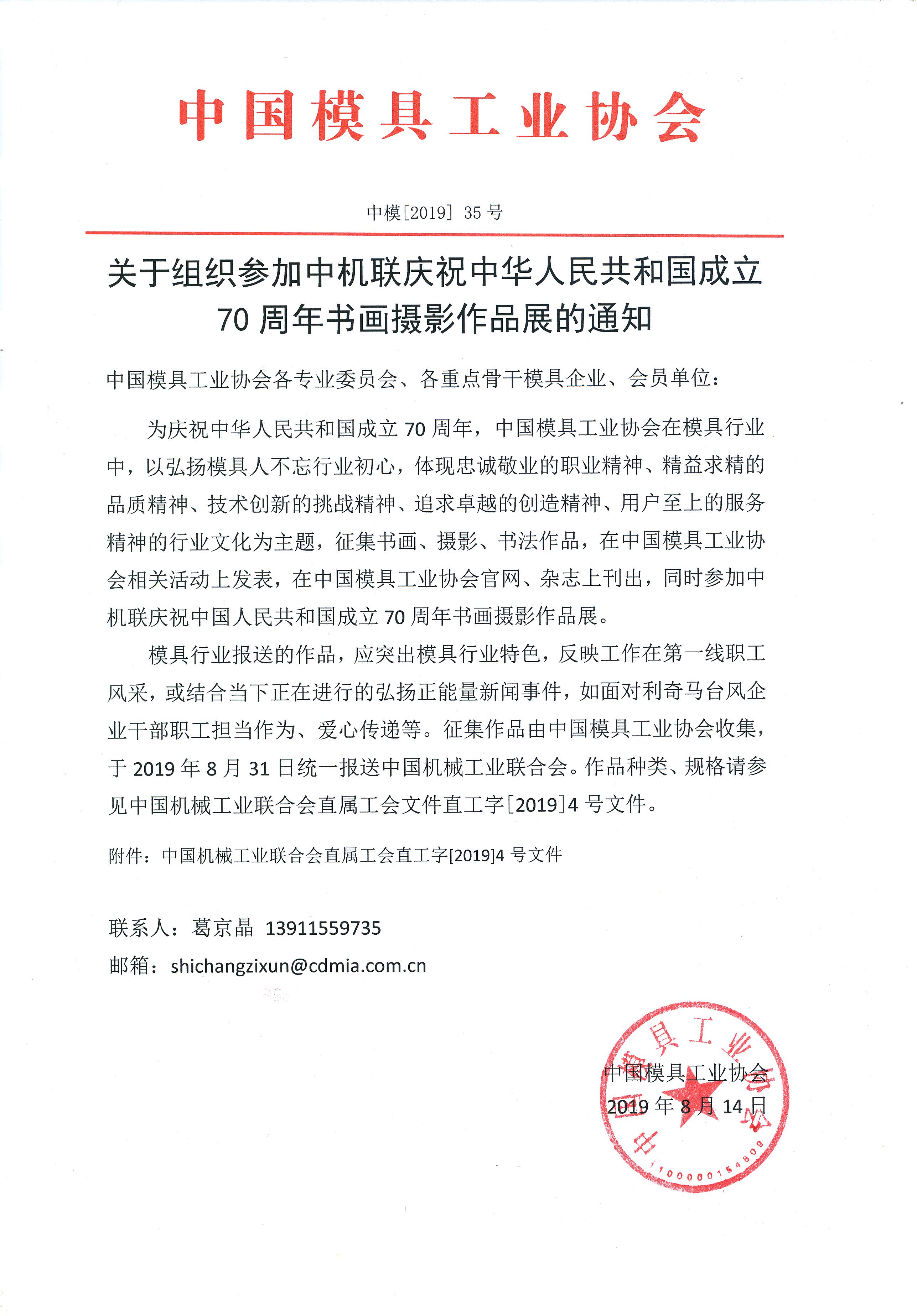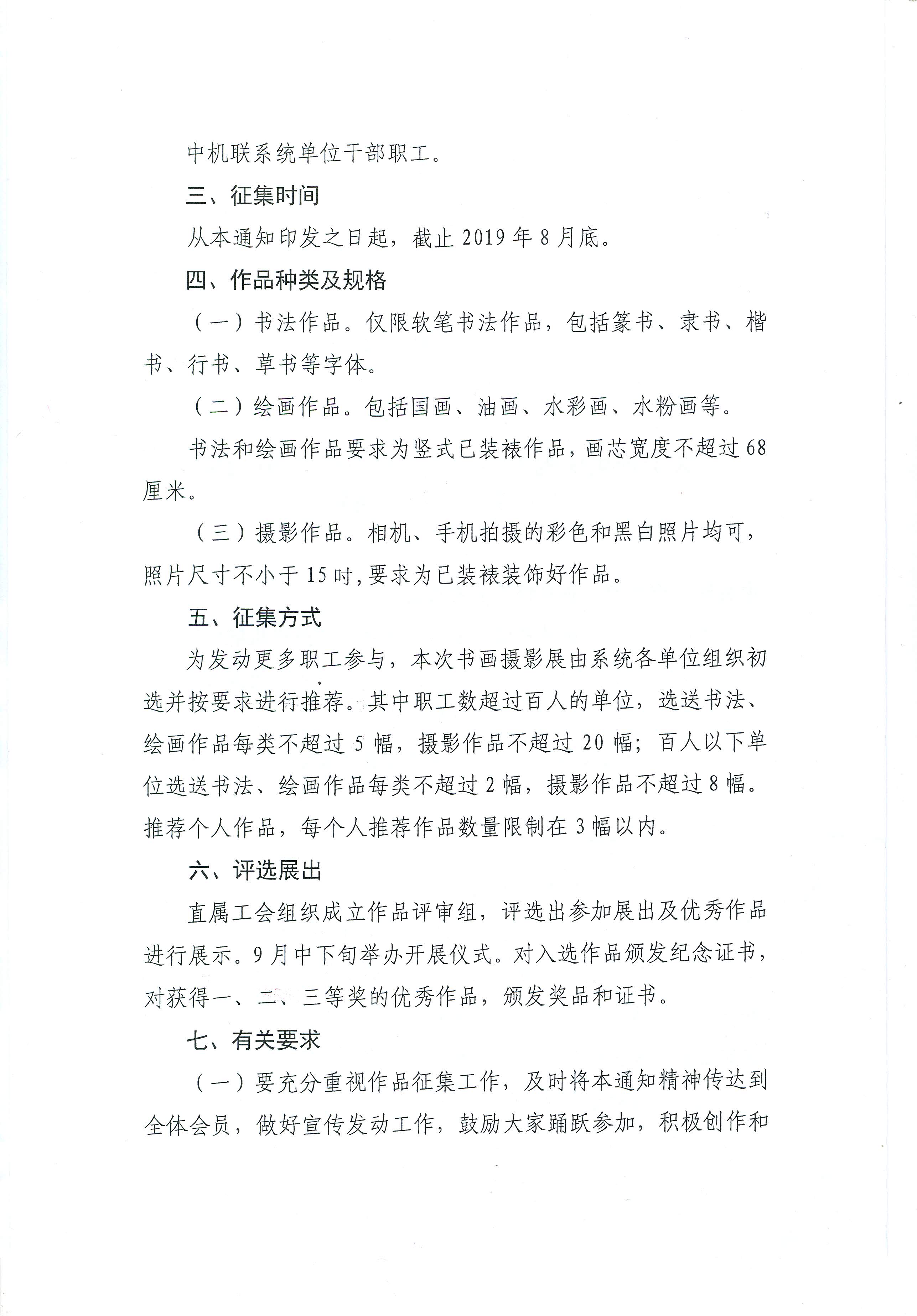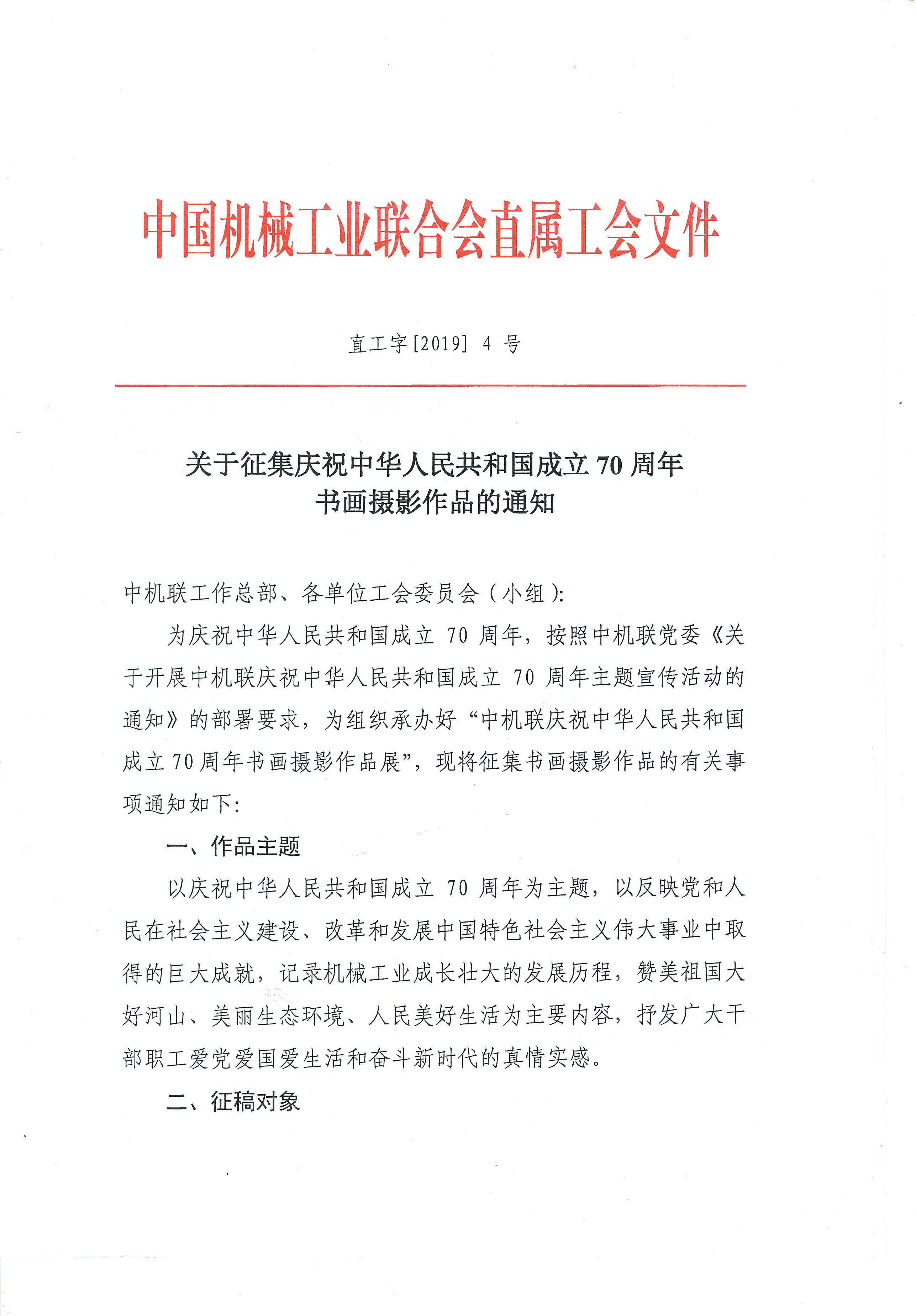 關(guān)于組織參加中機聯(lián)慶祝中華人民共和國成立70周年書(shū)畫(huà)攝影作品展的通知