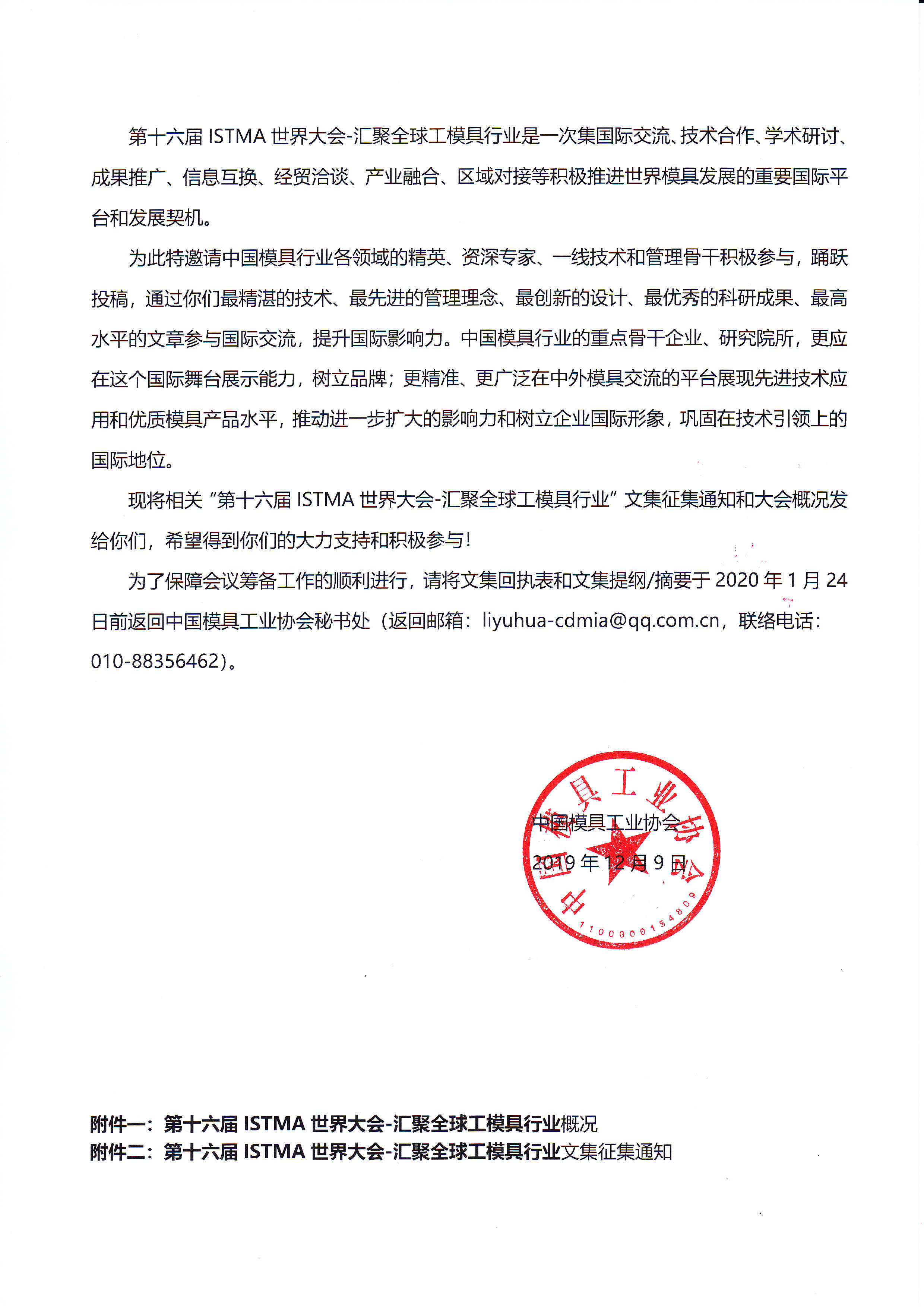 關(guān)于邀請參加“第十六屆ISTMA世界大會(huì )——匯聚全球工模具行業(yè)文集”征集文集稿件的通知