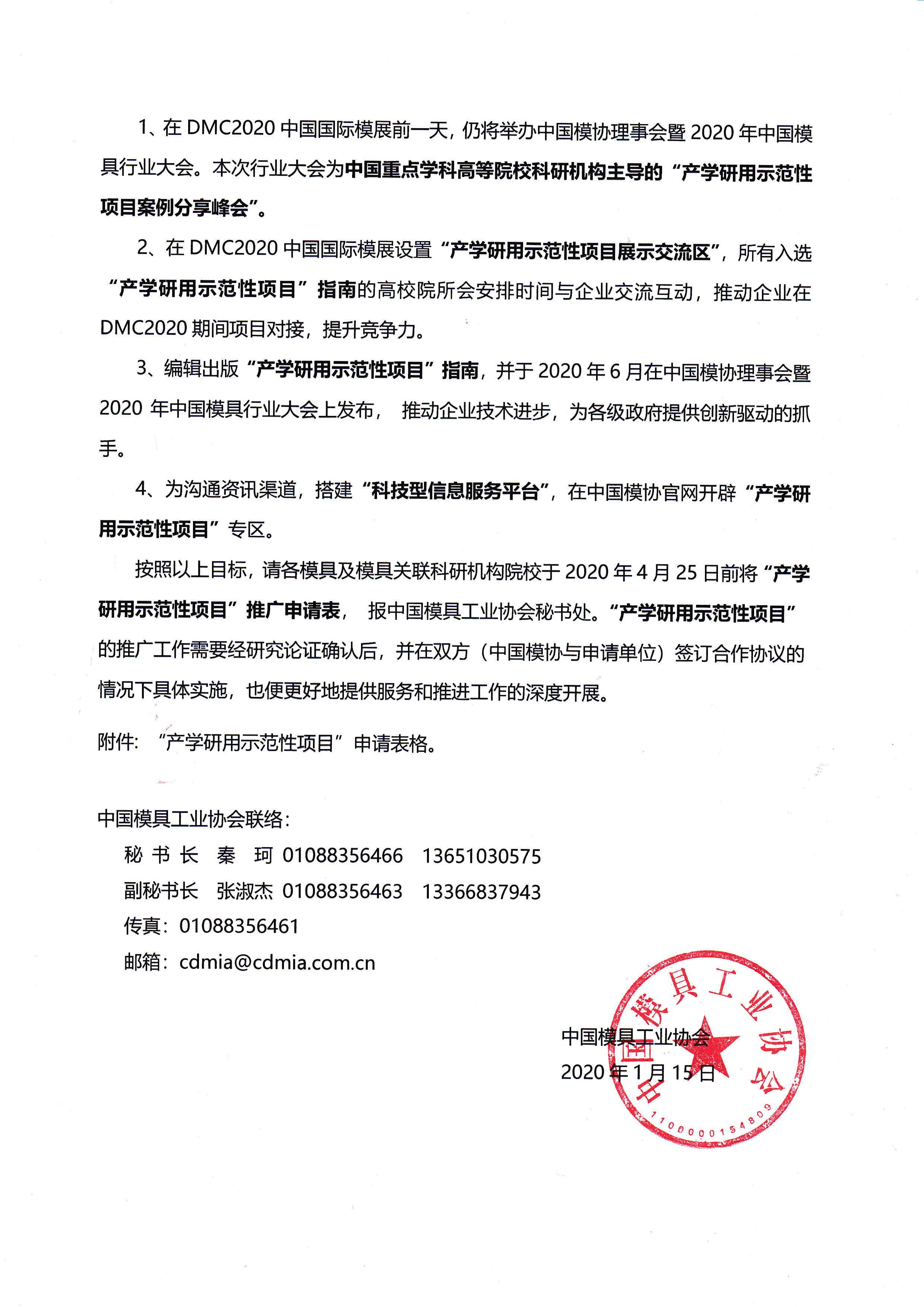 關(guān)于組織參加2020中國模具行業(yè)大會(huì )及“2020中國國際模具技術(shù)和設備展覽會(huì )產(chǎn)學(xué)研用示范項目展示專(zhuān)區”的通知