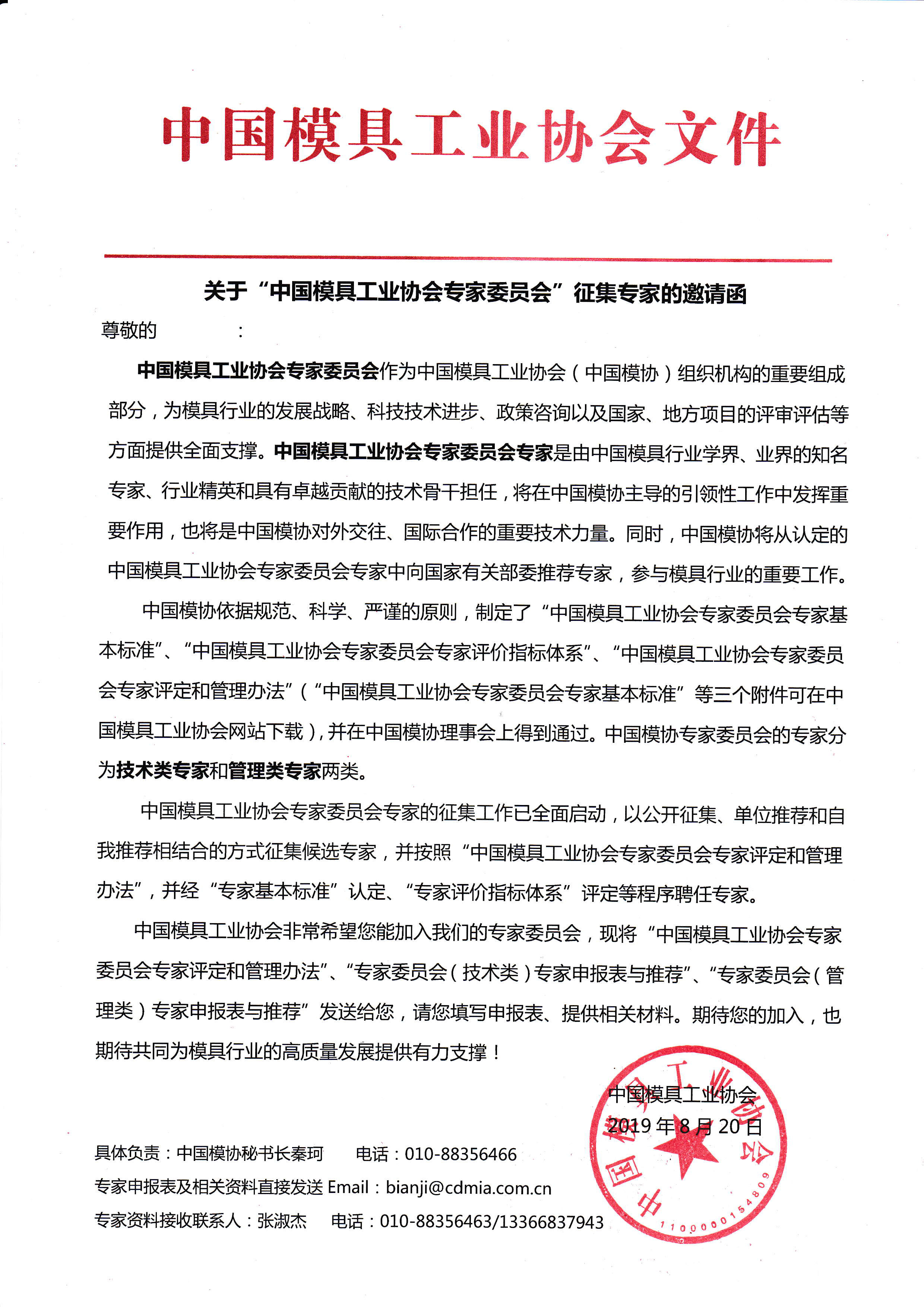 關(guān)于“中國模具工業(yè)協(xié)會(huì )專(zhuān)家委員會(huì )”征集專(zhuān)家的邀請函