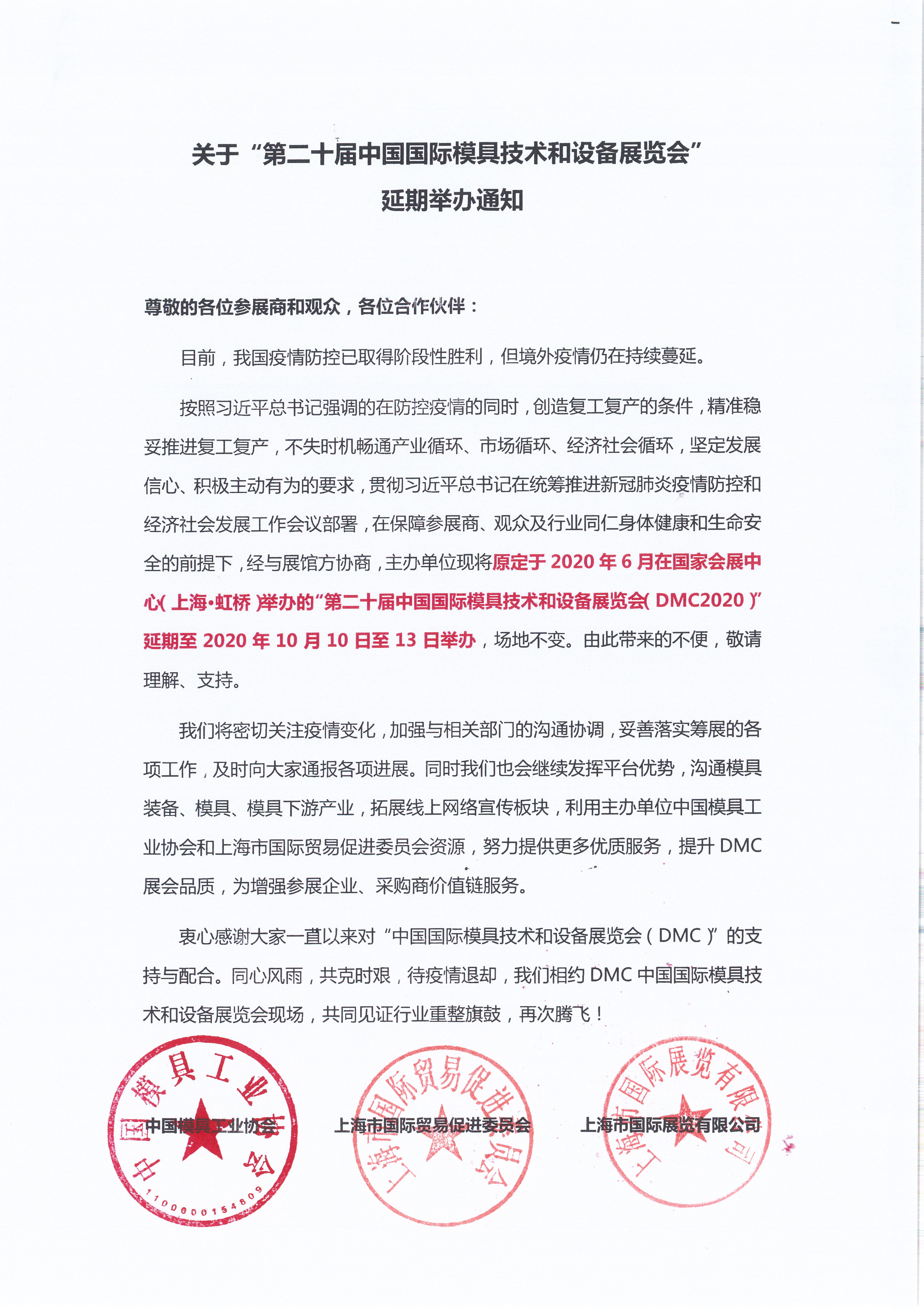 關(guān)于“第二十屆中國國際模具技術(shù)和設備展覽會(huì )”延期舉辦通知