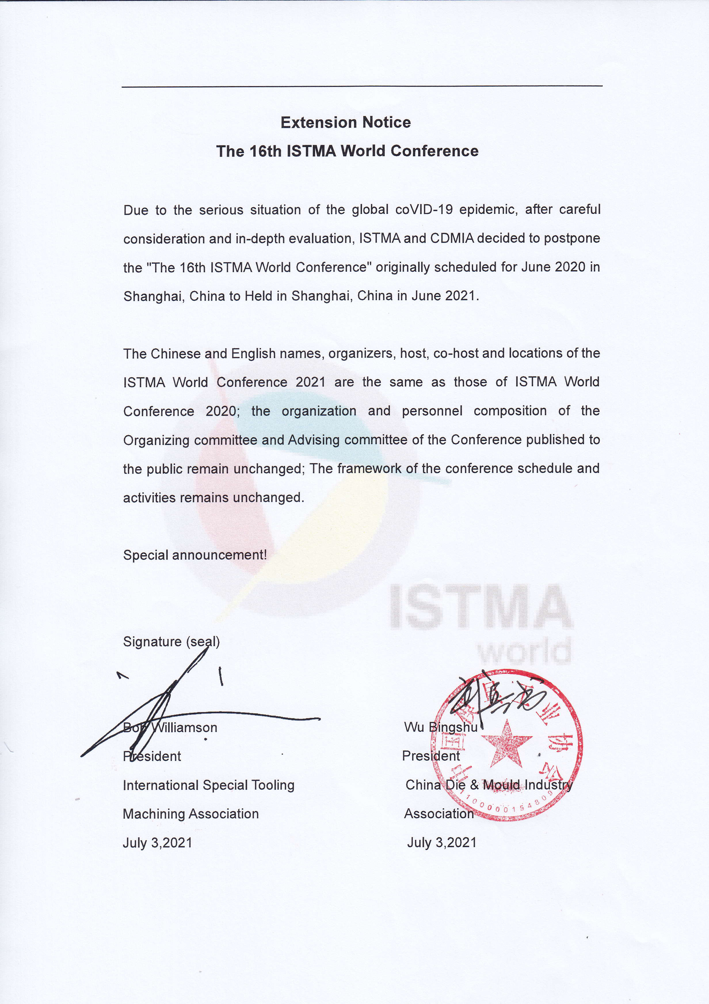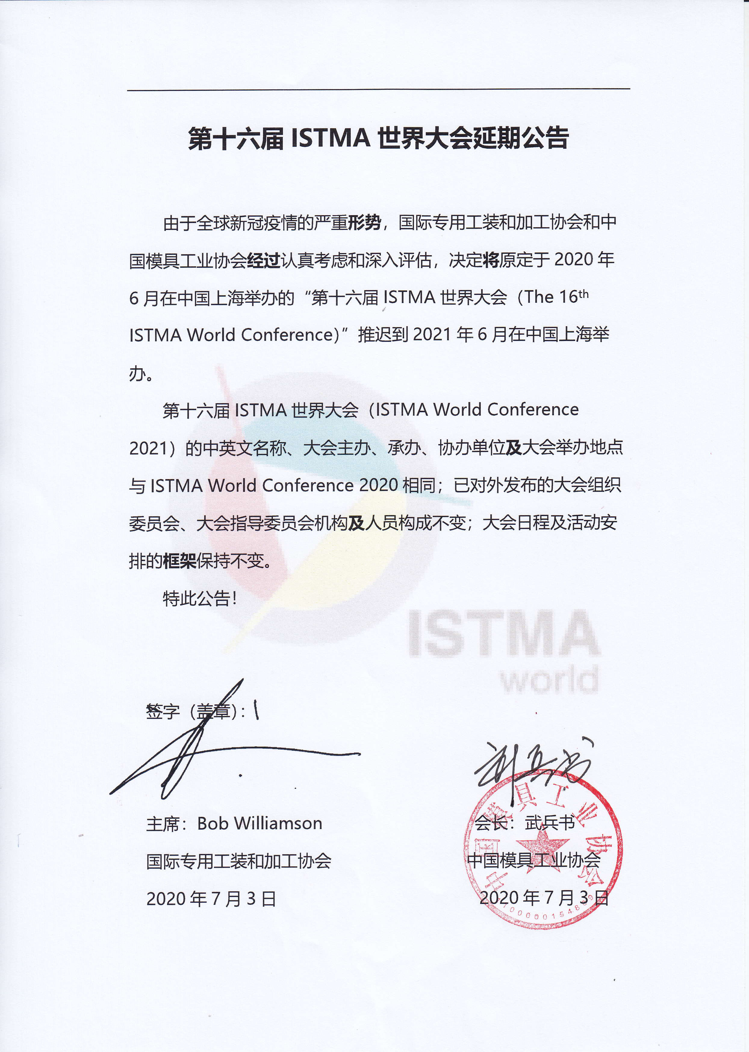 第十六屆ISTMA世界大會(huì )延期公告