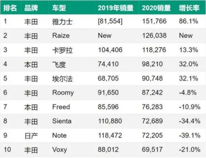 而在車(chē)型方面,雖然日本每年車(chē)型銷(xiāo)量排行榜單變化都很大,但2020年仍然是近年來(lái)變化最大的一次。銷(xiāo)量排名前10的車(chē)型沒(méi)有一款排名與前一年相同,而2019年的銷(xiāo)量冠軍豐田普銳斯更是跌出了榜單前十名,今年的銷(xiāo)量冠軍為去年排名第十位的豐田雅力士。細分車(chē)型方面,轎車(chē)和MPV仍是日本市場(chǎng)絕對主流,榜單前10中僅有豐田Raize一款SUV車(chē)型。