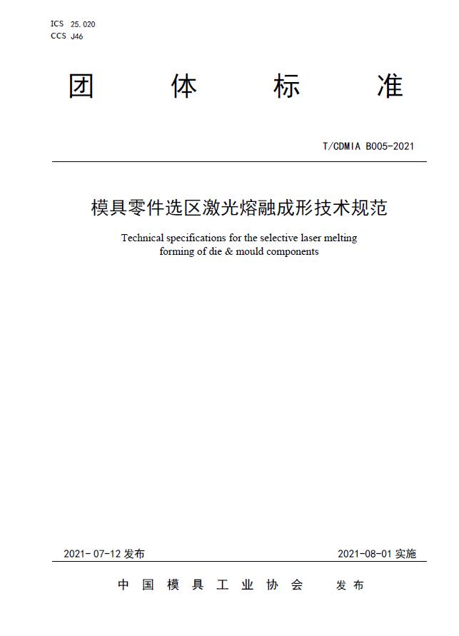 中國模協(xié)標準T/CDMIA B005-2021模具零件選區激光熔融成形技術(shù)規范