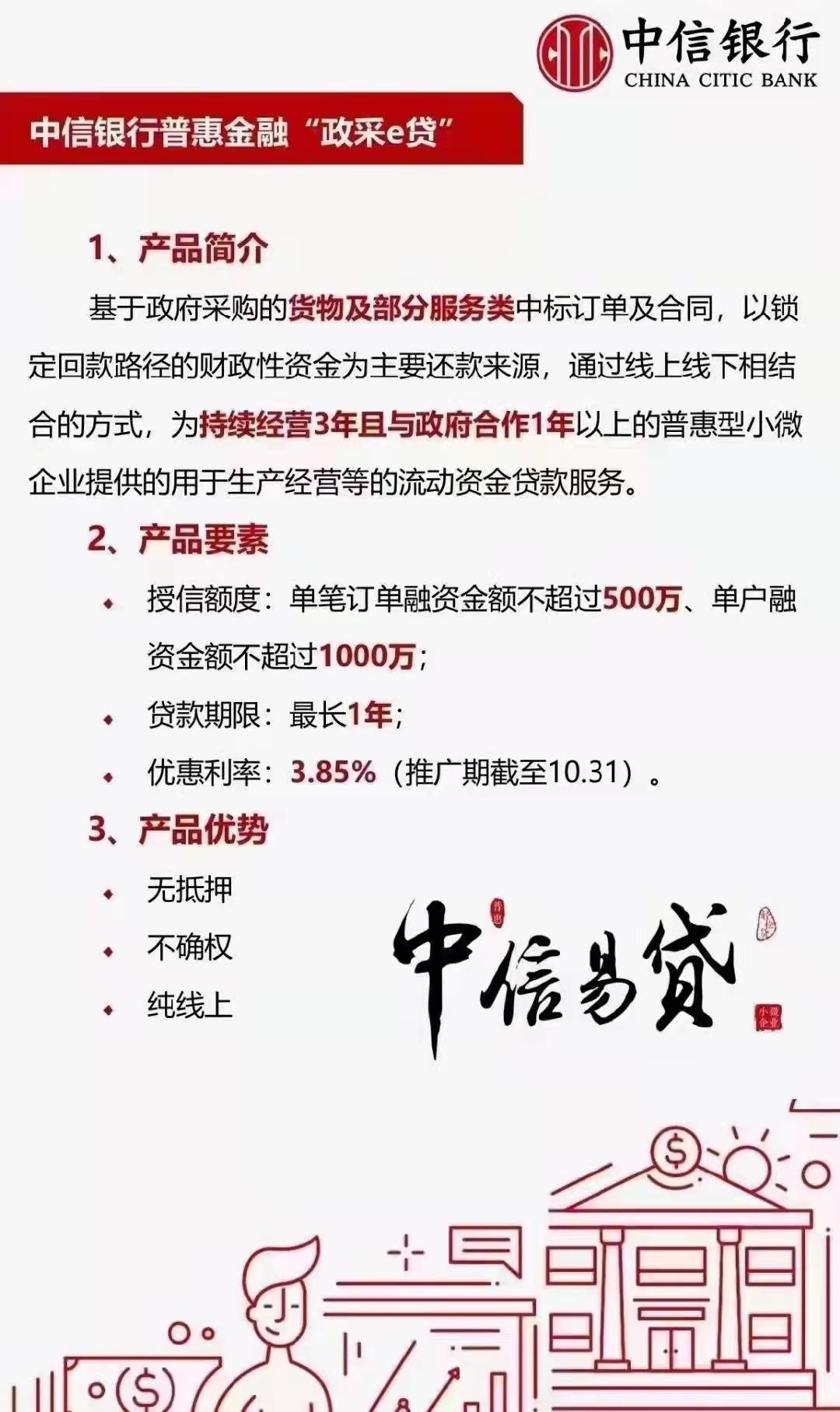 | 核心提示:中信銀行創(chuàng  )新推出“政采e貸”產(chǎn)品,著(zhù)力幫助解決部分小微企業(yè)在中標政府采購訂單后,因信息不對稱(chēng)等原因導致的“融資難”問(wèn)題,助力實(shí)體經(jīng)濟復蘇。