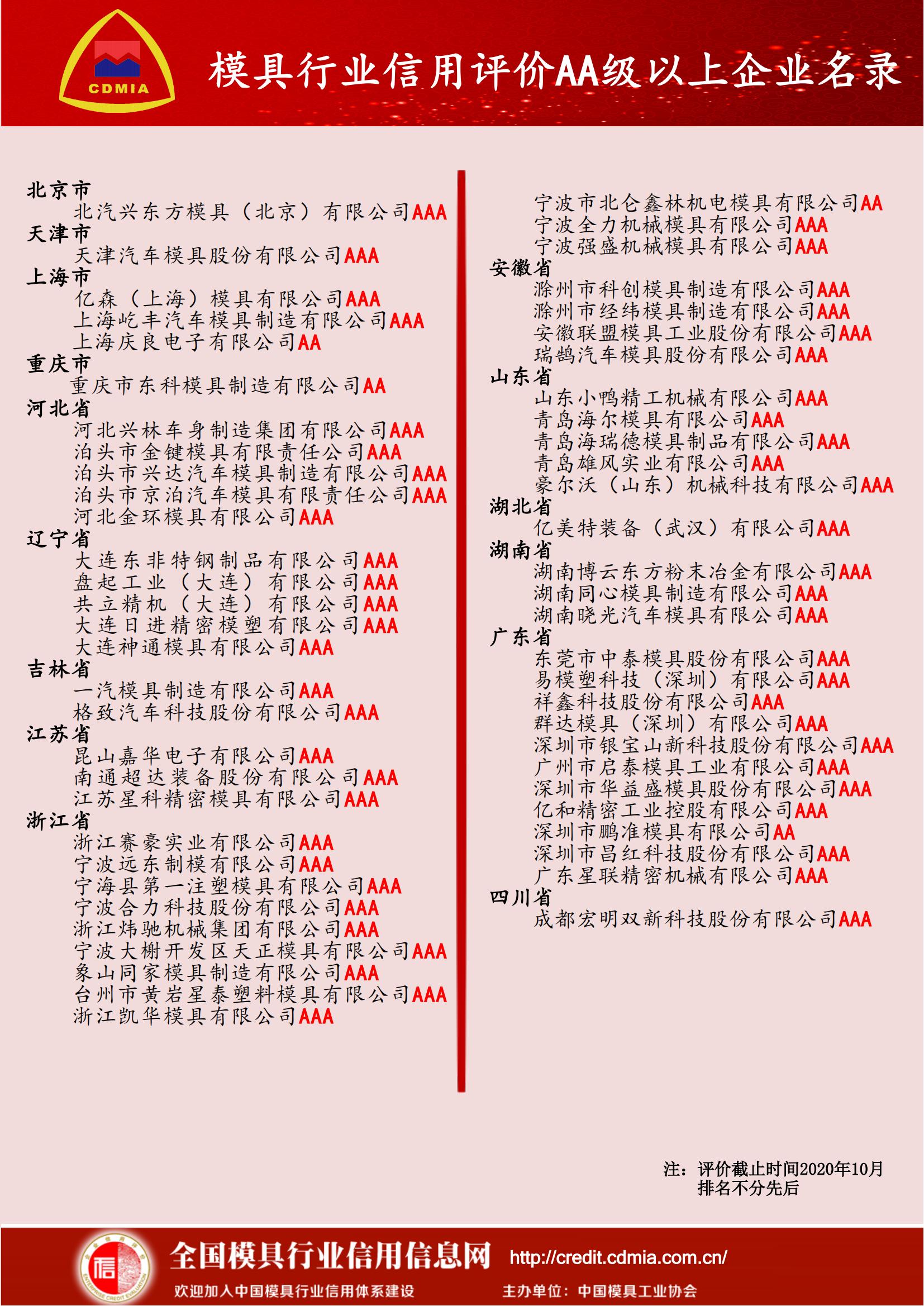 模具行業(yè)信用評價(jià)AA級以上企業(yè)名錄