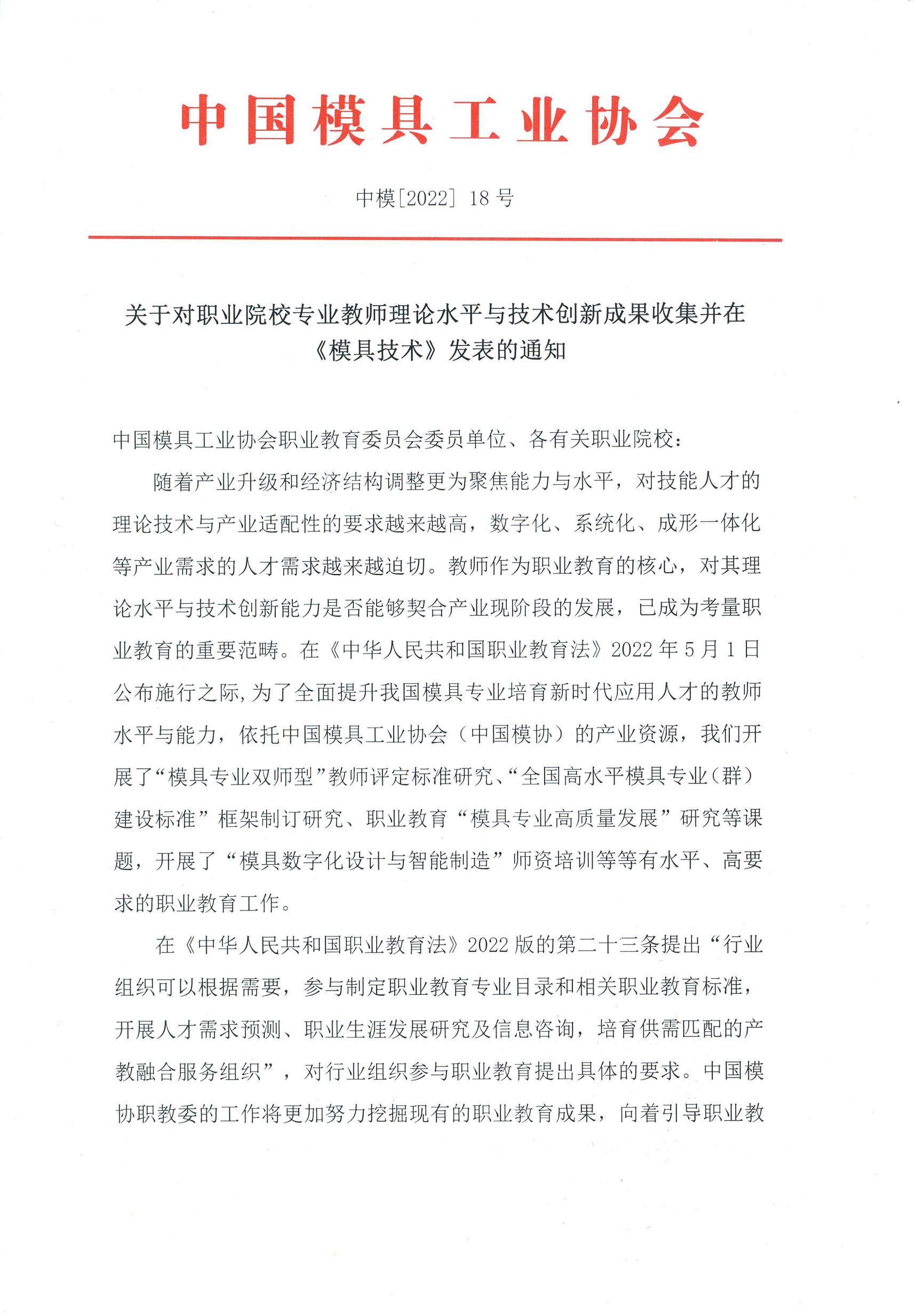 關(guān)于對職業(yè)院校專(zhuān)業(yè)教師理論水平與技術(shù)創(chuàng )新成果收集并在《模具技術(shù)》發(fā)表的通知