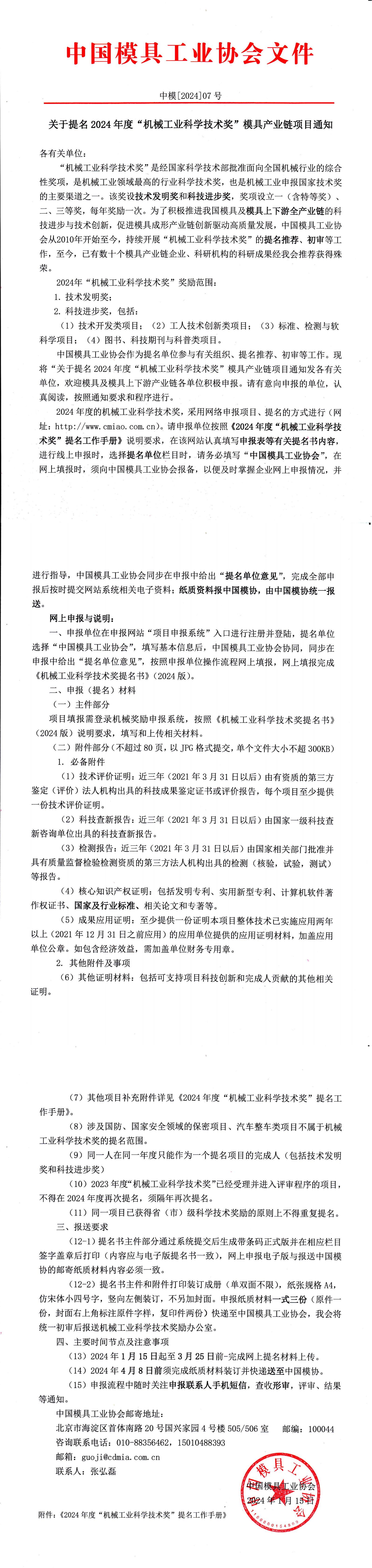 關(guān)于提名2024年度“機械工業(yè)科學(xué)技術(shù)獎”模具產(chǎn)業(yè)鏈項目通知